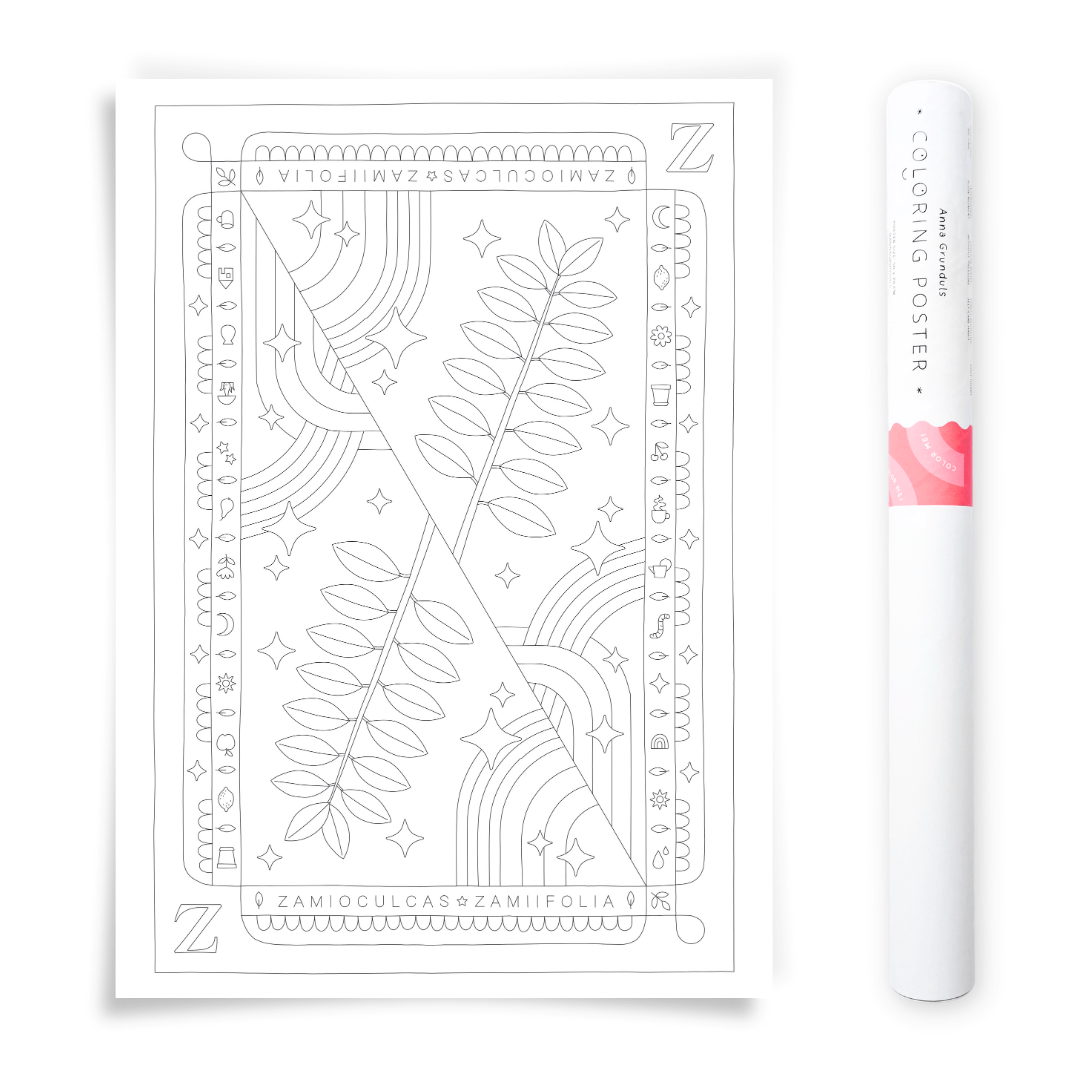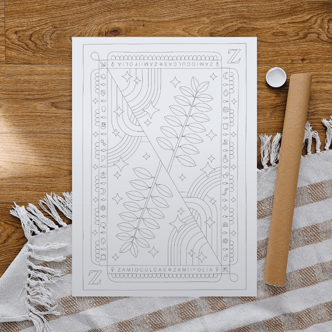 Your ZZ Plant sits proudly on the shelf, thriving no matter how often you forget to water it. Now your wall wants one too! This DIY coloring poster features the famous Zamioculcas zamiifolia, also called the ZZ Plant, in a playful hand-drawn design. Pour yourself a cup of tea, grab your colored pencils or markers, and bring those glossy leaves to life. Printed on beautiful offset paper, your colors will look rich and vivid. It’s a cozy project for you, or a thoughtful gift for a plant-loving friend.